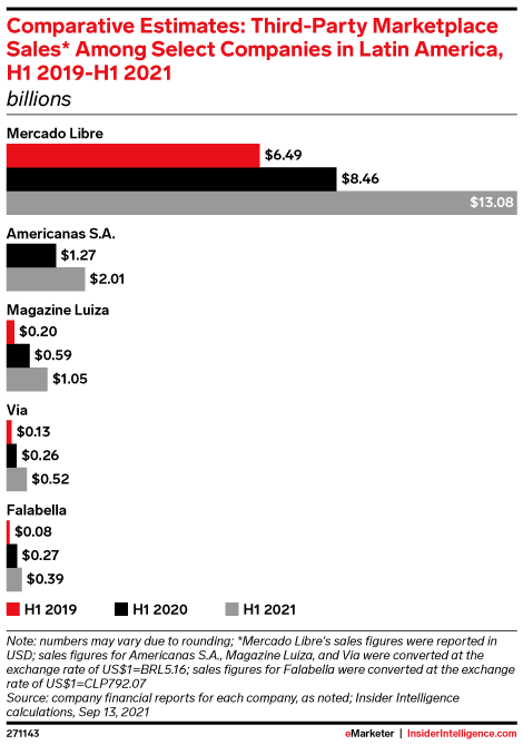 In H1 2021, Mercado Libre scooped up more than $13 billion in digital sales across Latin America, making it the region’s biggest ecommerce company.