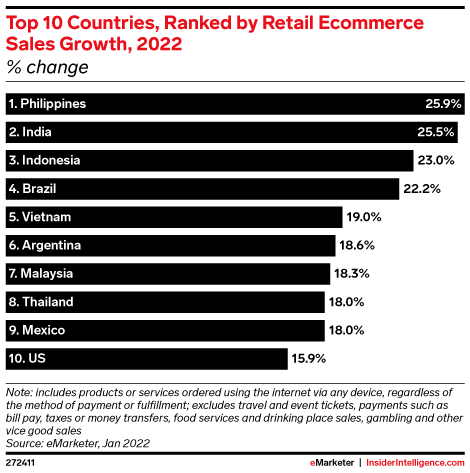 The Philippines and India will lead the world in retail ecommerce sales growth this year, with respective increases of 25.9% and 25.5%. Countries in Latin America and Southeast Asia will make up most of the top 10 list, while the last spot will go to the US, the only advanced economy to slide into the rankings, with 15.9% growth.