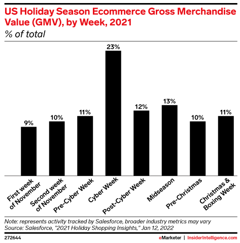 Cyber Week was the biggest ecommerce week of the US holiday season in 2021, accounting for 23% of the online gross merchandise value (GMV) from that period. The week of December 12 was the second biggest, contributing a much smaller share, with 13% of ecommerce GMV.