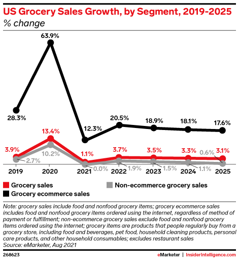 It’s no secret that US grocery ecommerce sales skyrocketed last year, shooting up by 63.9% over 2019. Our forecast reveals that growth will continue for the next few years, though not at the same unprecedented rate.