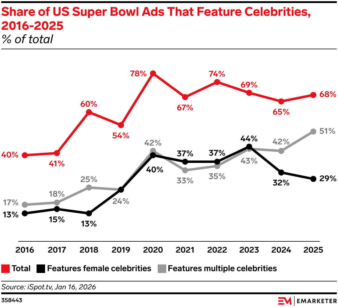 Humor and celebrity now dominate Super Bowl ads; brands now favor memeable, star-driven comedy as safer attention drivers and a chance at social-media virality.