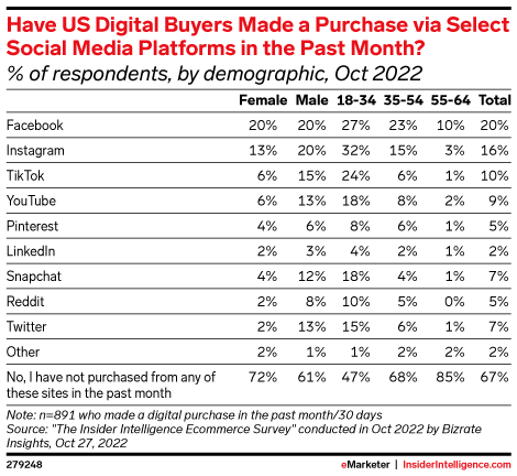 Social buyer penetration is climbing rapidly at TikTok. In the US, the app has already outpaced Pinterest by this metric, per our forecast. By the end of 2023, it will beat Instagram and tie with Facebook.
