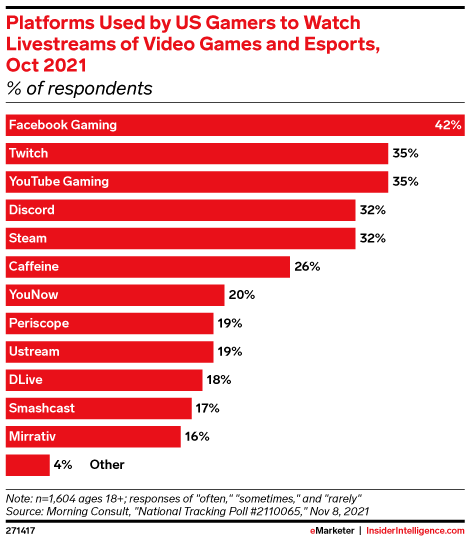 Among US gamers, Facebook Gaming is the most popular destination for viewing live gameplay, with 42% watching esports and other gaming livestreams on the platform.