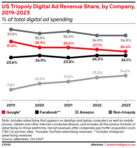 The triopoly of Google, Facebook, and Amazon will rake in 64.0% of this year’s $211.20 billion in US digital ad spending, about the same share as 2020 and up 1 percentage point from 2019.