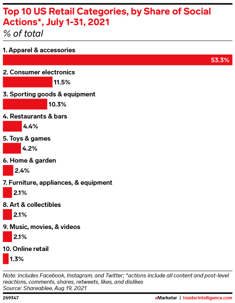 Among US retail categories, apparel and accessories has the biggest social media footprint, accounting for 53.3% of all posts and reactions to content, like comments and shares, across Facebook, Instagram, and Twitter in July 2021.