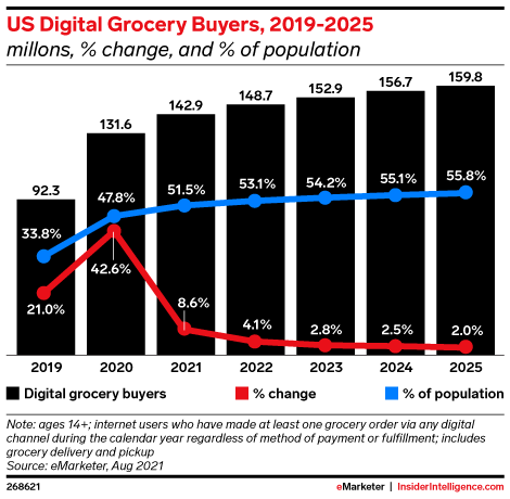 The pandemic has been a boon for digital grocery adoption. In 2020, the number of digital grocery buyers increased by more than 39 million. While growth won’t be as significant in 2021, it will still be a landmark year, as digital grocery buyers will surpass 142 million, amounting to more than half the US population (51.5%) for the first time.
