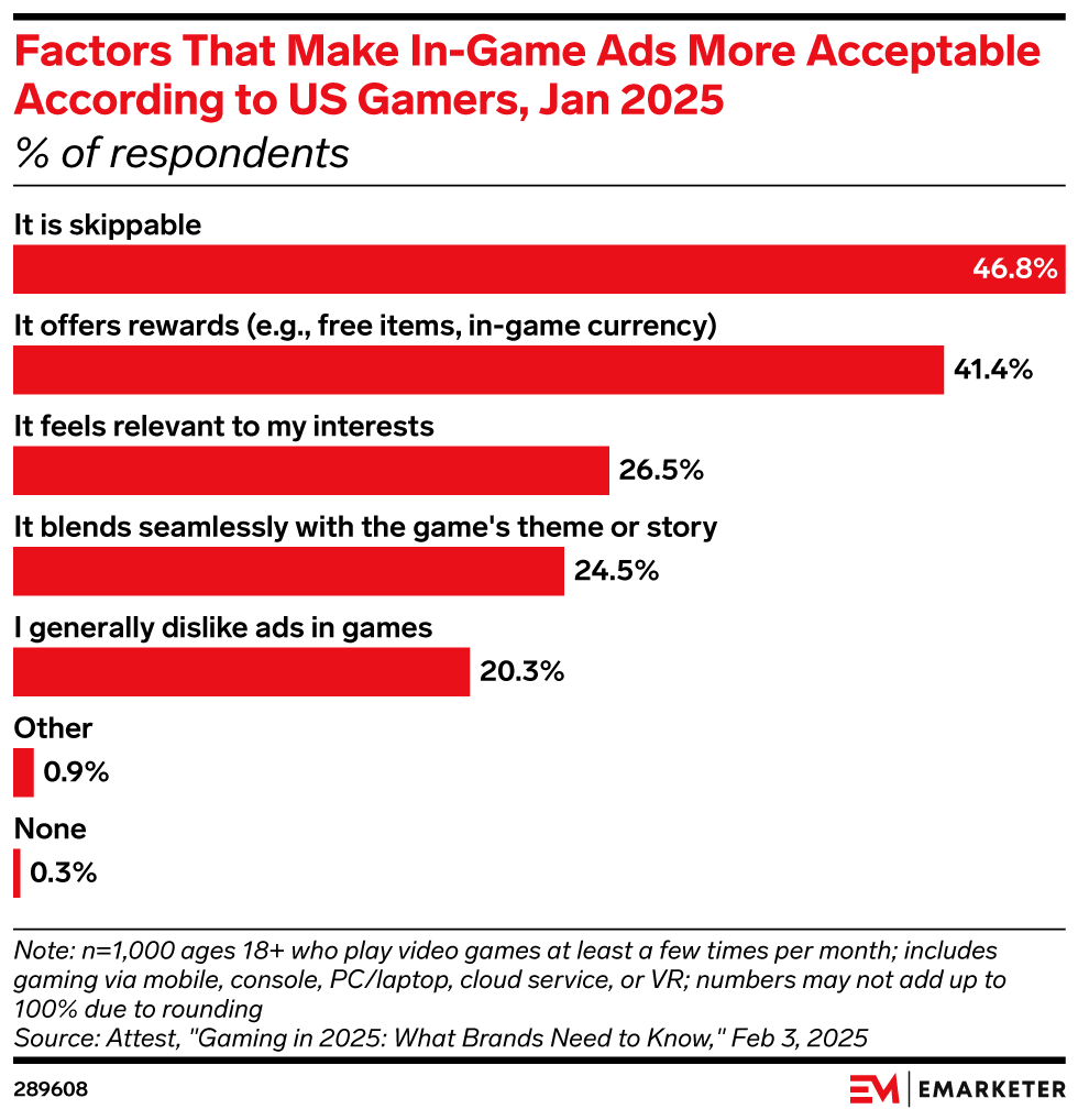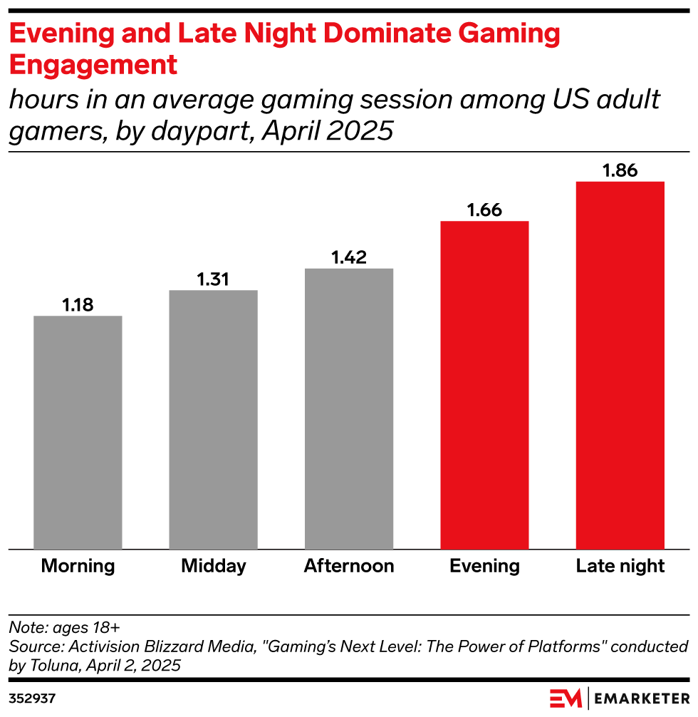 The news: Gaming is becoming a powerful vehicle for delivering ads to engaged audiences, with gamers spending significant time gaming across platforms, per a study from Activision Blizzard Media. Seventy percent of gamers play or watch video games daily, while 95% play or watch weekly. Seventy-seven percent of weekly gamers play on mobile devices, while 52% play on console and 34% play on PC. Our take: In-game advertising provides reach that few other channels can match, connecting with an engaged, highly attentive, and diverse audience, making it a critical touchpoint—but advertisers must understand what strategies work best.