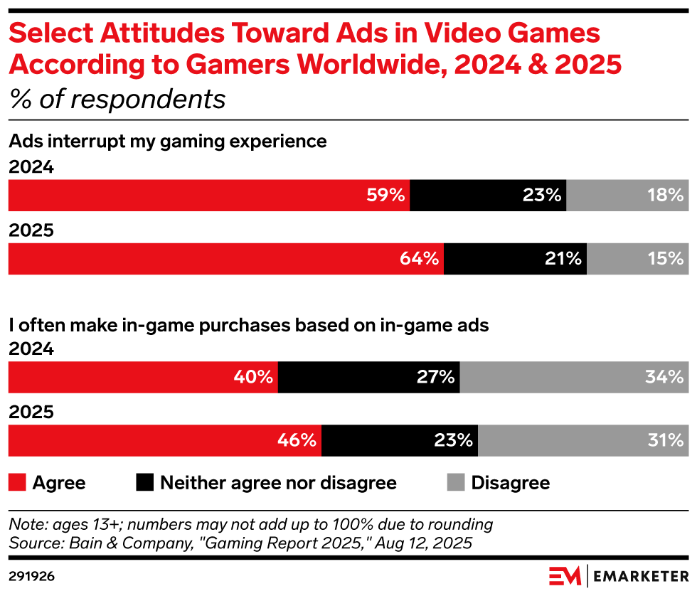 The news: Gamers are more involved in gaming content than ever before, thanks in large part to titles like Roblox, Minecraft, and Fortnite. And they’re not keeping that interest solely on-platform. 46% of gamers say their time spent creating in-game video game content has somewhat or significantly increased over a year ago, per Bain & Company’s Gaming Report 2025. About 20% say they spend less time. 27% of gamers’ social media time and 25% of their streaming video time is spent focused on gaming-related content. Our take: The gaming audience is growing, and it’s not focused on a single platform or console. Gamers’ interests reach through the game and into social media, streaming, TV, and audio, giving marketers a wide path to reach gamers where they are.