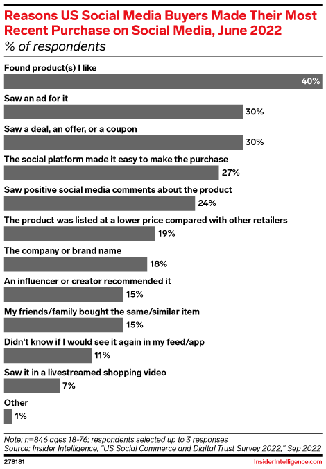 For many buyers, it’s simple: They make a purchase when they find something they want to buy. There are, of course, many ways that social users can find products they like on social media. And our exclusive primary research reveals that there is a multitude of other reasons why buyers choose to make purchases on social platforms.