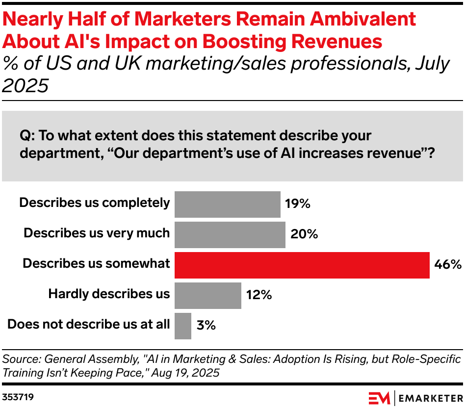 The news: Many marketers and salespeople doubt AI’s ability to boost company revenues or customer satisfaction. Some even believe it adds to their workload, signaling a disconnect between AI adoption and employee confidence. Only 39% of marketers and sales professionals in the US and UK are confident that their departments’ use of AI drives revenues, per General Assembly’s AI in Marketing & Sales report. Nearly half (46%) believe AI only somewhat improves the customer experience or doesn’t at all. Our take: Organizations that prioritize tailored training and tie outcomes to KPIs like team efficiency and customer satisfaction could help employees feel empowered and translate AI investments into measurable impact.