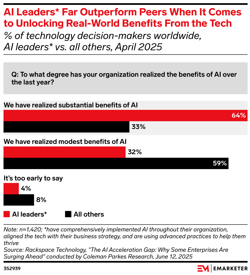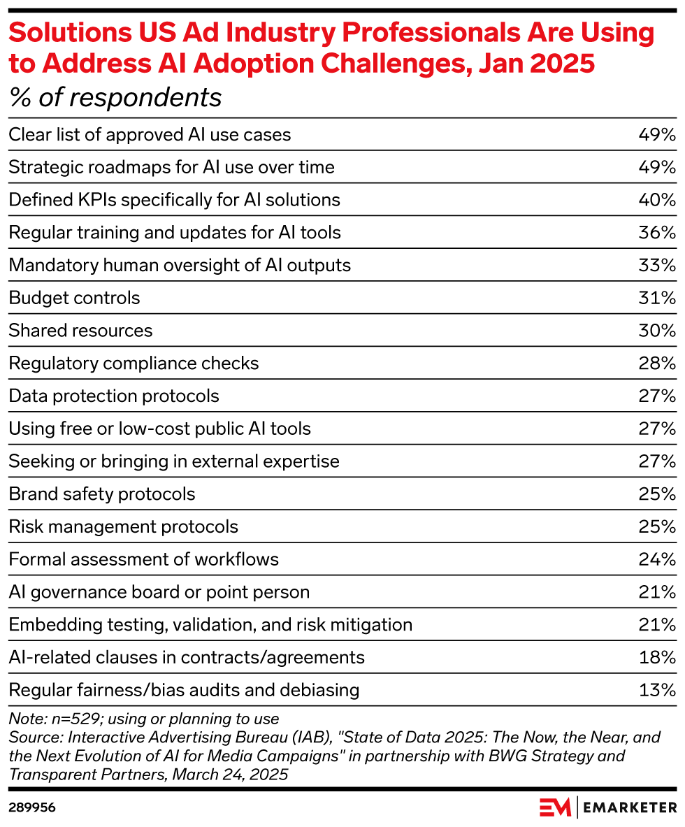 The news: Generative AI (genAI) has become standard across US enterprises—95% of companies report using it to some extent, up from 83% a year ago, per Bain & Co—but wider enterprise adoption is hitting roadblocks. A lack of robust governance and the need for continuous security validation are getting in the way. Our take: To escape limbo, enterprises must shift from experimentation to disciplined execution. That means building AI governance into the foundation—not as an afterthought. Security, transparency, and trust must be embedded into every AI deployment. Businesses shouldn’t just see AI as a plug-and-play solution without vetting it and aligning it with desired outcomes. For marketers, campaigns built on shaky AI foundations risk brand reputation, compliance failures, and consumer mistrust.