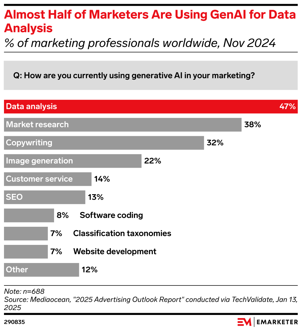 The trend: From insight generation and content creation to media placement and regulatory reviews, generative AI (genAI) is becoming more connected to every part of pharma marketing. Our take: The tech is helping pharma marketers and ad agencies create more personalized ads and better predict ad performance—but overall, genAI usage is still pretty nascent in the industry.