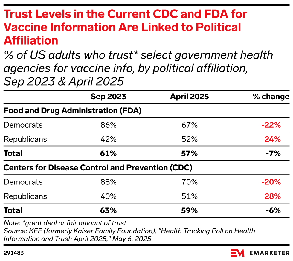The trend: US consumers are losing faith in most components of the healthcare system, including federal health agencies and their leaders, drugmakers, insurers, and hospitals. Our take: Marketers at healthcare and pharma organizations (including providers, insurers, public health agencies, and drugmakers) must develop strategies to rebuild trust and guide patients to reliable information during a time of great uncertainty. Vaccine makers should partner with trusted medical groups, local physicians, and pharmacists to develop educational materials with clinical data that counter vaccine hesitancy among consumers. Pharma companies and insurers should address consumer frustrations through open public dialogue and provide transparent explanations for controversial pricing decisions. Drugmakers should additionally monitor condition-specific forums and social platforms like Reddit, where consumers share treatment experiences, and use these spaces to offer cost-saving tools for pricey medications.