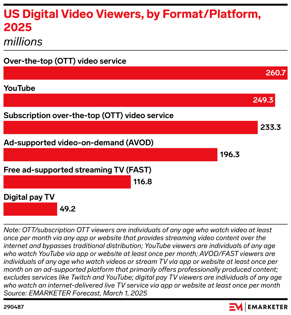 OTT video—including YouTube, subscription OTT, AVOD, and free ad-supported streaming TV—is extremely popular in nearly all forms. But traditional pay TV continues to reach new lows.