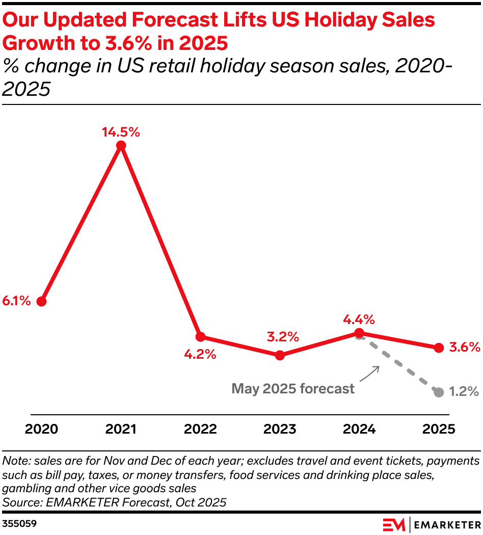 A slate of retailers boosted their outlooks following strong Q3 performances, a positive sign as the industry heads into the most important shopping period of the year. Best Buy, Dick's Sporting Goods, Abercrombie & Fitch, and Kohl's all updated their FY sales guidance, pointing to ongoing consumer resilience despite growing pessimism about the state of the economy and personal finances. The outlook for holiday spending is notably stronger than it appeared earlier this year: We expect sales in November and December to rise 3.6% YoY, slower than last year’s 4.4% growth but a significant upgrade from our May forecast.