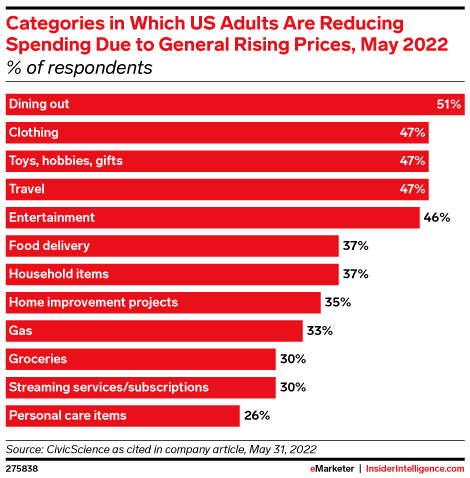 Rising prices have US adults lowering their costs, and 51% of these cost-cutters are spending less on dining out. Other expenses are in their crosshairs as well: 47% are shelling out less for clothing, toys, travel, and entertainment.