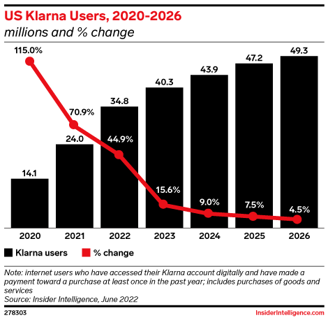 Some 40 million people will use Klarna in the US next year, marking a 15.6% increase for the buy now, pay later (BNPL) service. Over the coming years, growth will slip into the single digits, a far cry from the 115.0% surge back in 2020.