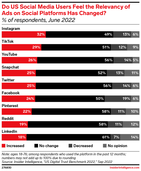 Pinterest was seen as the safest social media platform in the US last year, though the percentage of users who held that view declined from 2020 (51% versus 41%), according to our “US Digital Trust Benchmark 2022” report. Meanwhile, Facebook was where the lowest percentage of users felt safe, down to just 26% in 2022.