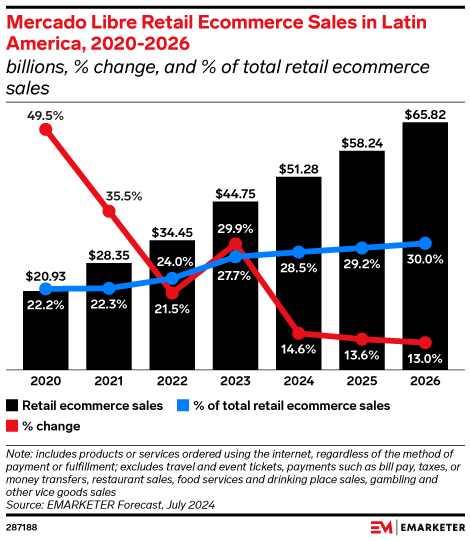 Mercado Libre is beating Amazon at its own game in Latin America: The former is expected to represent more than half of all retail media ad spending in the region, while the latter continues to lose share to local players in Brazil and Mexico.