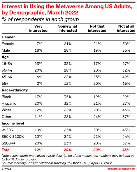 Some 3% of US adults have already purchased real estate in a metaverse environment, and a further 8% are interested in staking their claim on a digital land plot. That said, more than half of US adults have never heard of virtual real estate, indicating we’re still a ways out from society going meta.