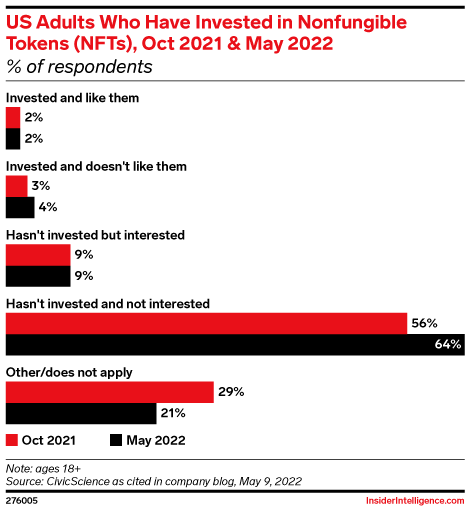 Is the shine off nonfungible tokens (NFTs)? As of May, just 2% of US adults surveyed have invested in NFTs and like them, while another 4% have invested but aren’t happy about it. The 64% majority said they have no investment or interest in these assets, up from 56% in October 2021.