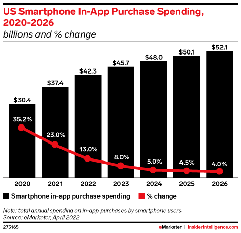 US smartphone in-app purchase spending will hit $42.31 billion this year, up 13.0% over 2021. Growth will slow to the single digits over the next few years, and spending will pass the $50 billion mark in 2025.