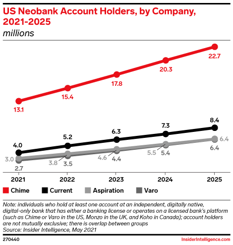 Chime was the most downloaded US mobile banking app in 2021, with 12.8 million downloads, up 16% from 2020. Other neobanks had a huge year as well: Current posted 67% growth in downloads, and Varo skyrocketed to 10th place with a 529% increase. That said, traditional banks took the rest of the top five positions.