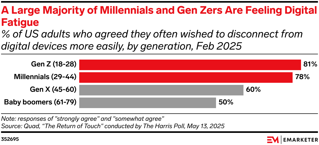 Despite growing up online, Gen Z and millennials prefer in-person shopping and socializing, creating opportunities for minimalist tech and physical brand experiences.
