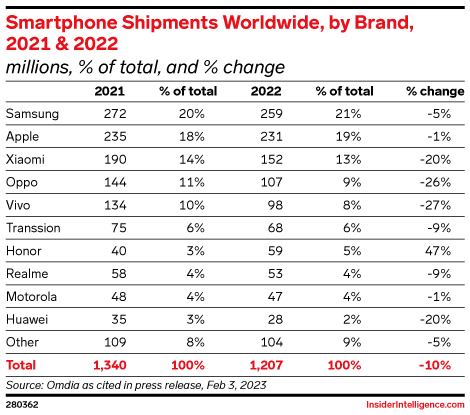 In 2022, Samsung is expected to ship 276 million smartphones worldwide, maintaining its lead over Apple, with 243 million.