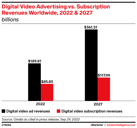Global digital video ad revenues will top $360 billion in 2027, according to Omdia. That’s up more than $170 billion from this year. By contrast, video subscription revenues will rise about $30 billion over that period and remain below $120 billion in 2027.