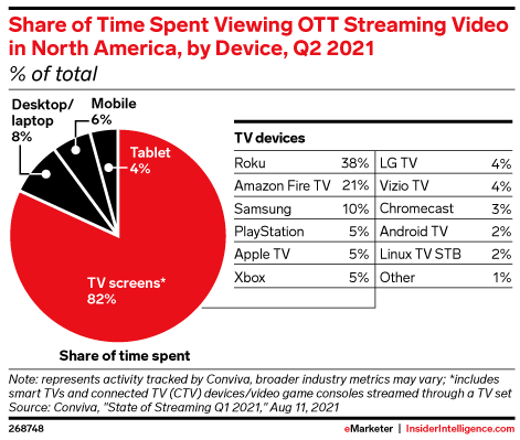 In North America, TV is the dominant screen for viewing OTT video content, accounting for 82% of time spent on the activity in Q2 2021.