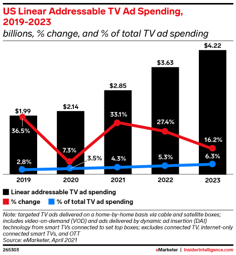 Before the pandemic, linear addressable TV ad spending was soaring in the US, with annual growth rates of 50.7% in 2018 and 36.5% in 2019. But that spending increased by just 7.3% in 2020, amid advertising budget cuts in the TV industry.