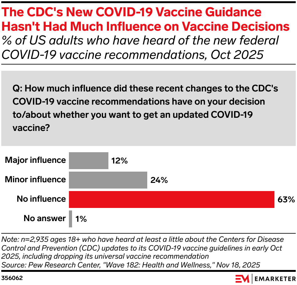 Most consumers aren’t too familiar with the CDC’s recent COVID-19 vaccine guideline changes, and those who have heard about them say the updates are unlikely to affect their decision to get the shot, according to an October 2025 Pew Research Center survey. Vaccine makers can partner with medical groups and pharmacies to disseminate information through traditional and digital media. Communication shouldn’t challenge CDC guidance or politicize the issue, but should explain where to get the shot, note any insurance changes, and outline special considerations for people with certain medical conditions.