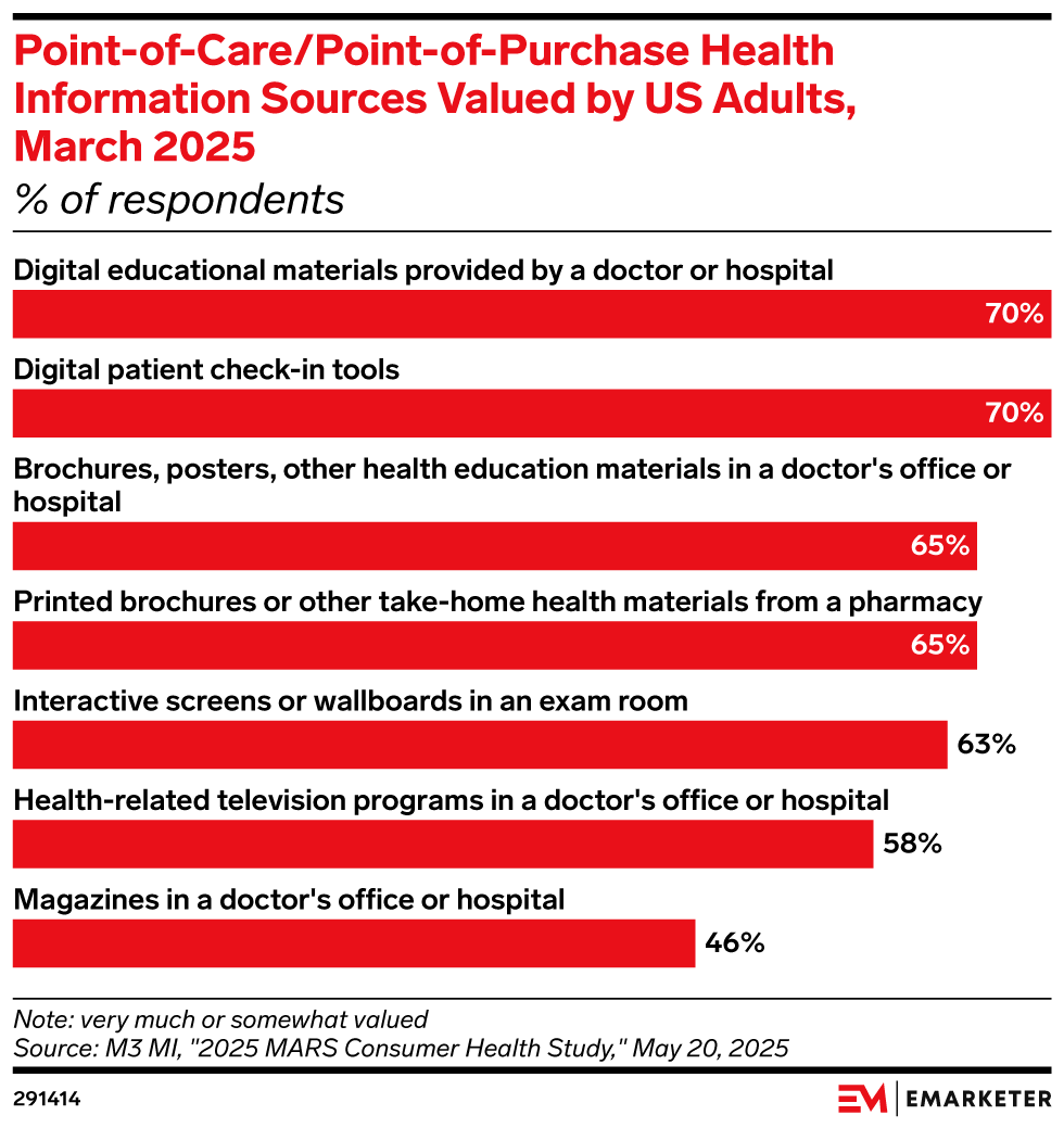 Pharma marketers are increasingly investing in point-of-care (POC) marketing. Pharma marketers should be able to effectively integrate traditional media advertising with POC content. For example, marketers could use similar wording, data, and testimonials in a TV/online campaign as they do in a POC ad to improve audience retention. Similarly, a TV commercial may spark initial awareness of a prescription drug, while POC ads reinforce it with QR codes or digital resources that patients can explore in the waiting room, or cost-saving information provided at the pharmacy counter.