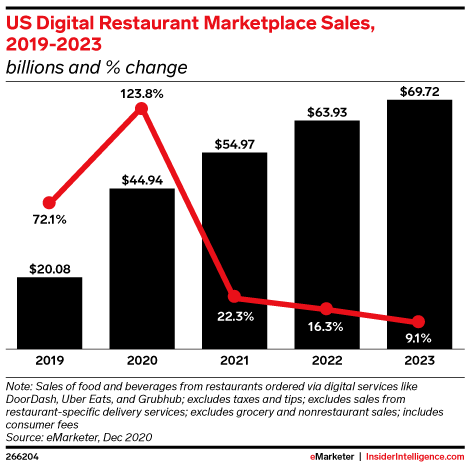 US digital sales of food and beverages from restaurants soared 123.8% last year, per eMarketer estimates. This massive increase was the result of more consumers using delivery services like DoorDash, Uber Eats, and Grubhub amid lockdowns and restaurant closures.