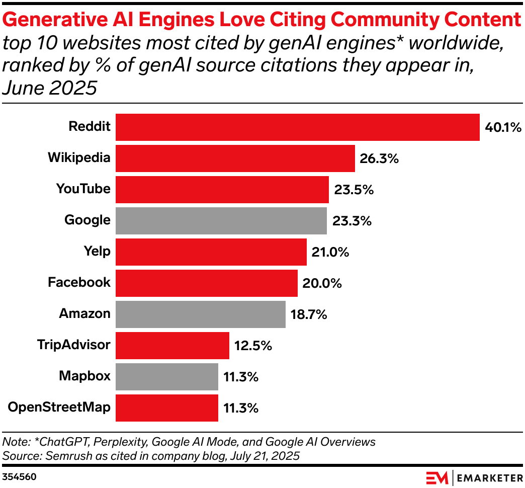 Generative AI tools increasingly rely on community-driven platforms—Reddit, YouTube, Wikipedia, Yelp, TripAdvisor, and more—as primary sources that feed directly into consumer-facing answers. Because AI does not distinguish between search content, social chatter, reviews, creator posts, or earned media, brand visibility now depends on cross-team coordination rather than siloed optimization. Upstream conversations matter: if forums, reviews, or public commentary lack clarity or depth, AI responses will mirror those gaps. And because users often begin with general queries—not shopping-specific ones—early influence happens long before product discovery. To stay visible, brands must unify search, social, PR, and content workflows.