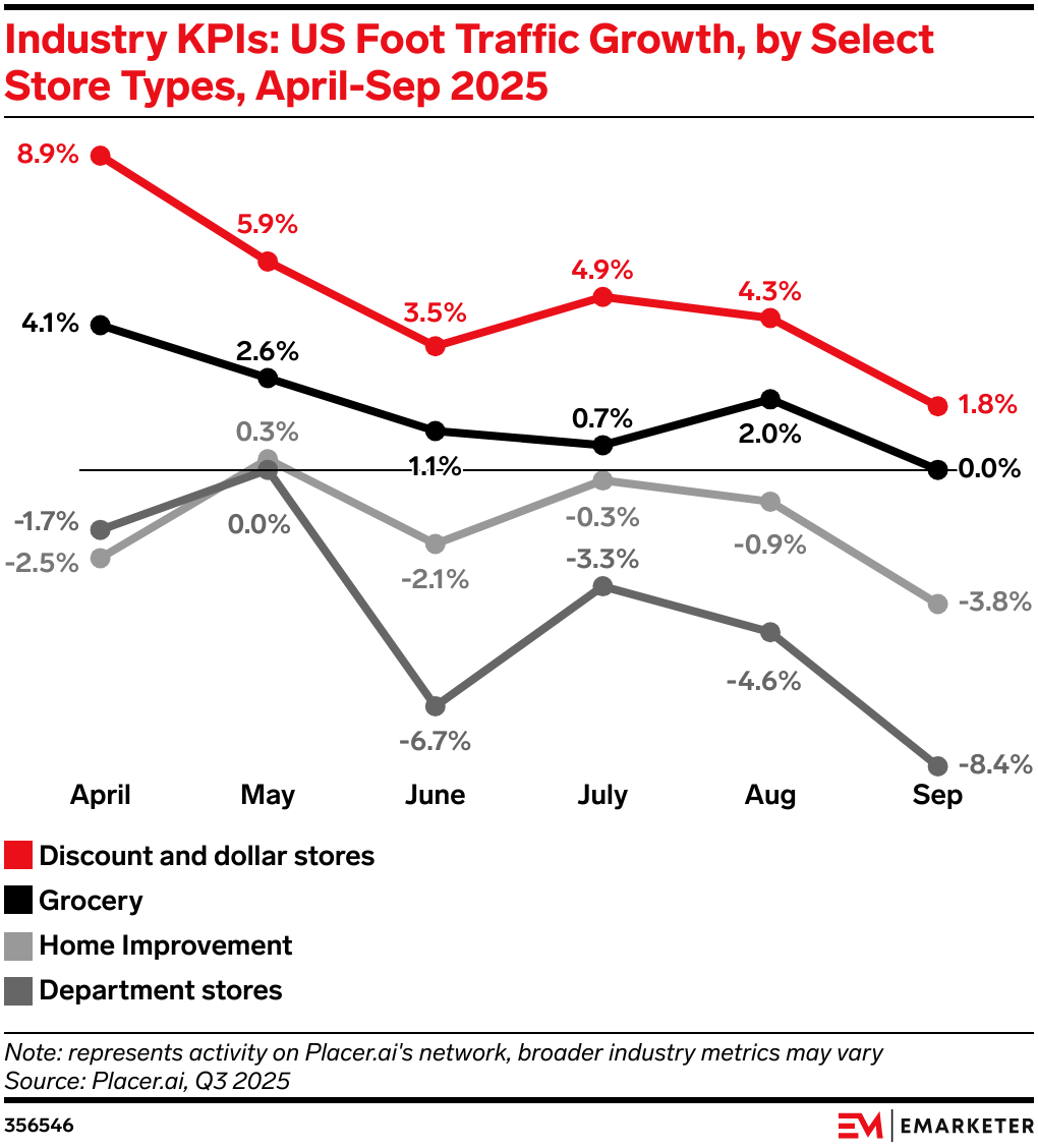 Foot traffic trends softened retail in Q3, a potentially troubling sign for holiday spending, according to our Industry KPI data from Placer.ai. The four categories tracked—discount and dollar stores, grocers, department stores, and home improvement stores—had slower growth from July to September, providing more evidence that consumers are feeling the strain of higher living costs. The data points to a rocky year-end for department stores and home improvement retailers, which have struggled this year to overcome sluggish consumer sentiment and uneven spending. At the same time, retailers that offer necessities and can deliver clear value are positioned to win.