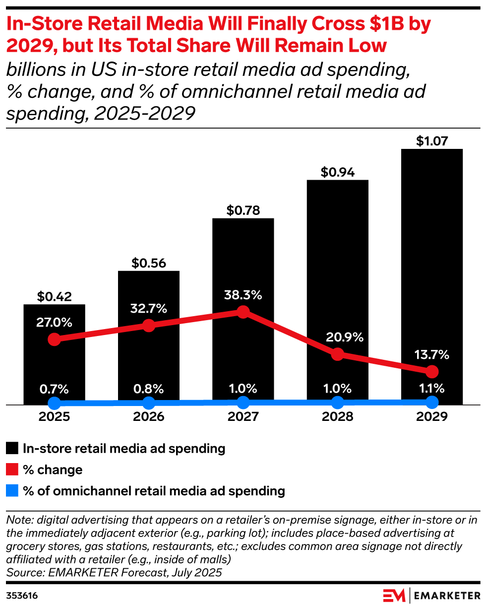 Looma raised $10 million in Series B funding and a $3 million credit facility to expand its network of 7,000 in-store screens, which now reaches 27 million shoppers monthly across major grocers such as Kroger and H-E-B. Its recent rollout to 600 Kroger wine and spirits departments followed a multiyear test that boosted category sales and delivered strong returns for featured brands. Although in-store retail media is scaling more slowly than expected, grocery remains a key proving ground, with most retailers planning activations. Success will hinge on solutions that pair broad reach with measurable sales lift—an area where Looma’s early results stand out.
