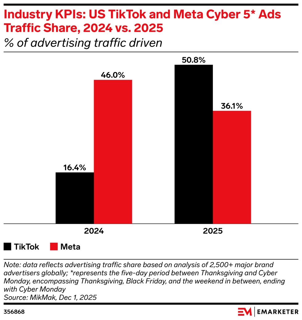 TikTok grabbed the lead in Cyber Five advertising traffic this year, passing the 50% mark, per Industry KPI data from MikMak, showing it was the main discovery channel for early holiday shoppers. TikTok’s major swing past Meta this year shows that it is proving more effective at routing users from content into product pages and retail websites where purchases take place. Despite TikTok’s ad traffic advantage, Meta had an edge in facilitating purchases. Meta posted a 6.8% conversion rate over the Cyber Five, compared with TikTok’s 1.06%. These trends suggest advertisers would benefit from using two strategies during the rest of the holiday season: using TikTok to spur demand and lure shoppers, but looking to Meta to convert that interest into sales.