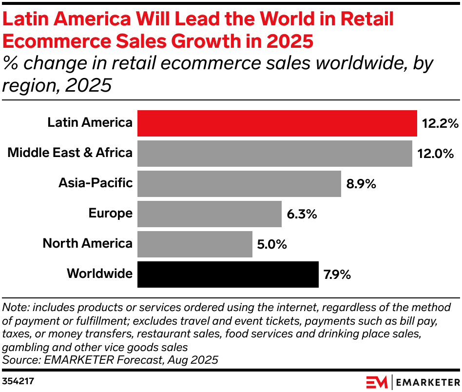 Latin America’s retail ecommerce market is set to surge 12.2% in 2025 to $191.25 billion, outpacing global growth and making it the fastest-growing region worldwide. Argentina, Brazil, and Mexico will drive 84.5% of total sales, with Argentina rebounding strongly, Brazil expanding through fierce platform competition, and Mexico surpassing the US in ecommerce penetration next year. Despite tariff threats and softening consumer sentiment, steady inflation and wage gains sustain momentum. EMARKETER analysts note that future success will depend on retailers’ agility amid shifting political and economic conditions across key Latin American markets.