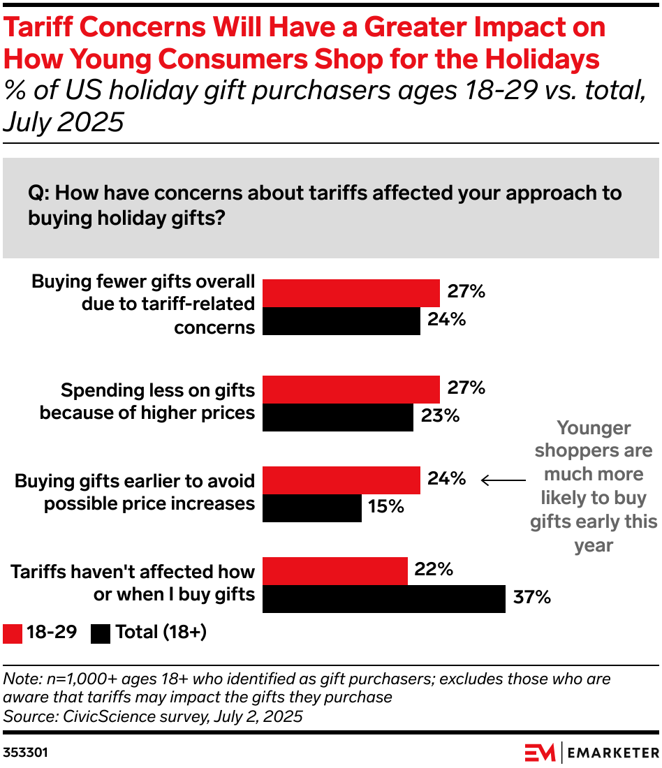 The forecasts: The holiday season may bring more gloom than cheer for retailers as consumers tighten spending amid economic uncertainty. Average per-person spend during the season is projected to fall 5.3% YoY to $1,552, PwC reports. That’s the first significant drop since the 2020 pandemic. Gen Z is leading the pullback, with their holiday budgets set to plunge 22.5% after soaring 37.4% in last year’s survey (their actual spending rose just 6%, per PwC’s card data). That reversal reflects the mounting pressure they face from a stagnant job market, rising fixed costs, and thin savings. One in 4 (25%) Gen Zers now say their finances are worse than a year ago, up from 17% in 2024. Tariffs may be amplifying the pullback. A July CivicScience survey found 54% of consumers under 30—along with 47% of all gift buyers—plan to buy fewer or cheaper gifts due to tariff concerns. While our forecast is somewhat brighter—we expect sales in November and December to grow 1.2% YoY—even that would mark the weakest holiday sales gain since we began tracking the metric in 2009. Our take: Retailers should meet consumers where they are this holiday season by offering budget-friendly choices such as smaller sizes, bundles, and gift sets, while also using loyalty programs to push their best customers to spend.