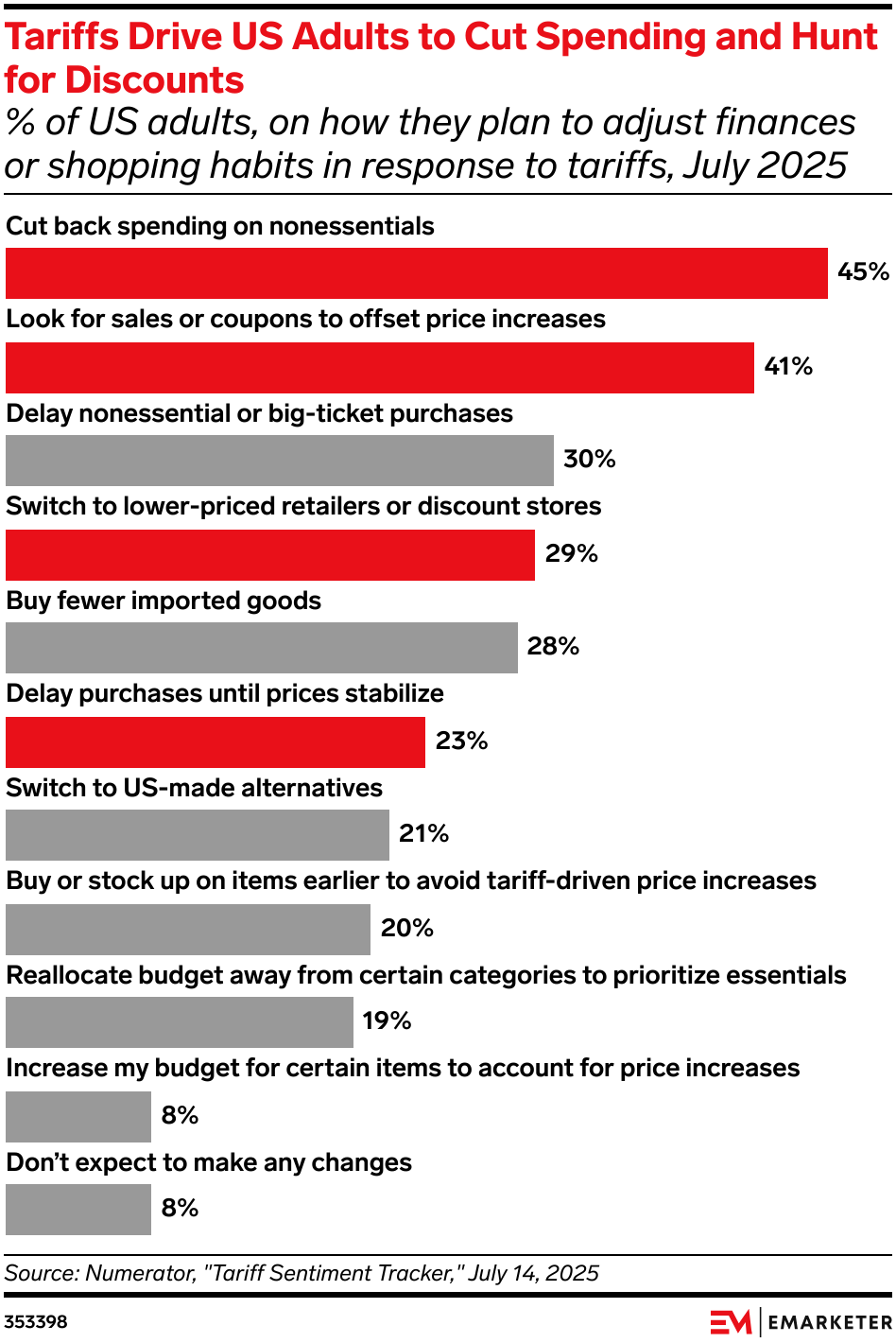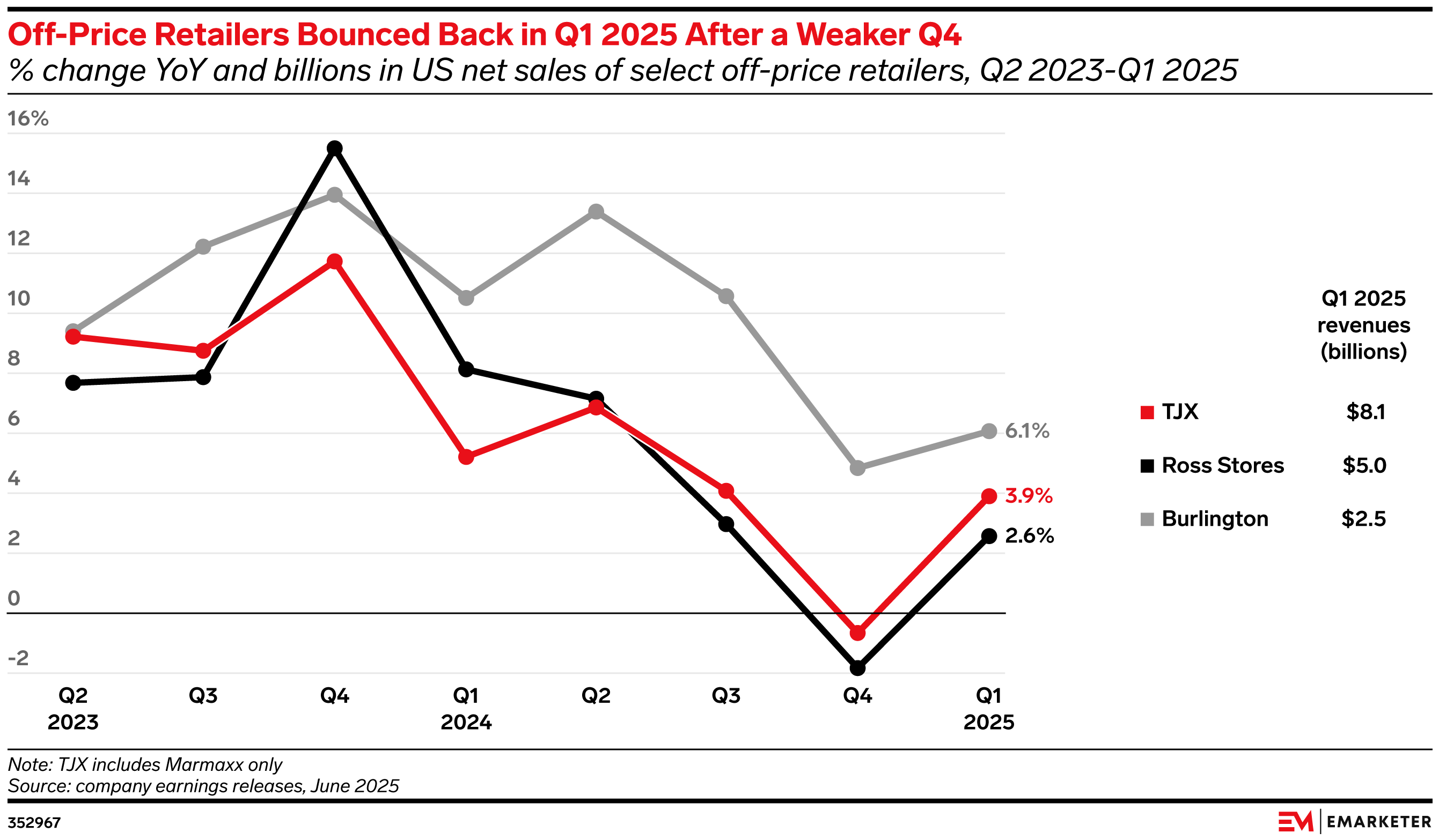 The situation: TJX is thriving as shoppers flock to its off-price value proposition. Our take: Off-price retailers like TJX’s T.J. Maxx and Marshalls are poised to thrive this holiday season, when consumers are likely to be both budget-minded and eager for discovery. TJX’s model allows it to avoid much of the tariff pain weighing on full-price retailers, since it sources excess merchandise at steep discounts. At the same time, retailers frontloading inventory in anticipation of tariff impacts may unintentionally flood the off-price channel with fresh product. That could create a double advantage heading into Q4: sharper values for shoppers, and a “treasure hunt” experience that can pull traffic away from department stores and specialty chains at a time when promotional intensity will be fierce.