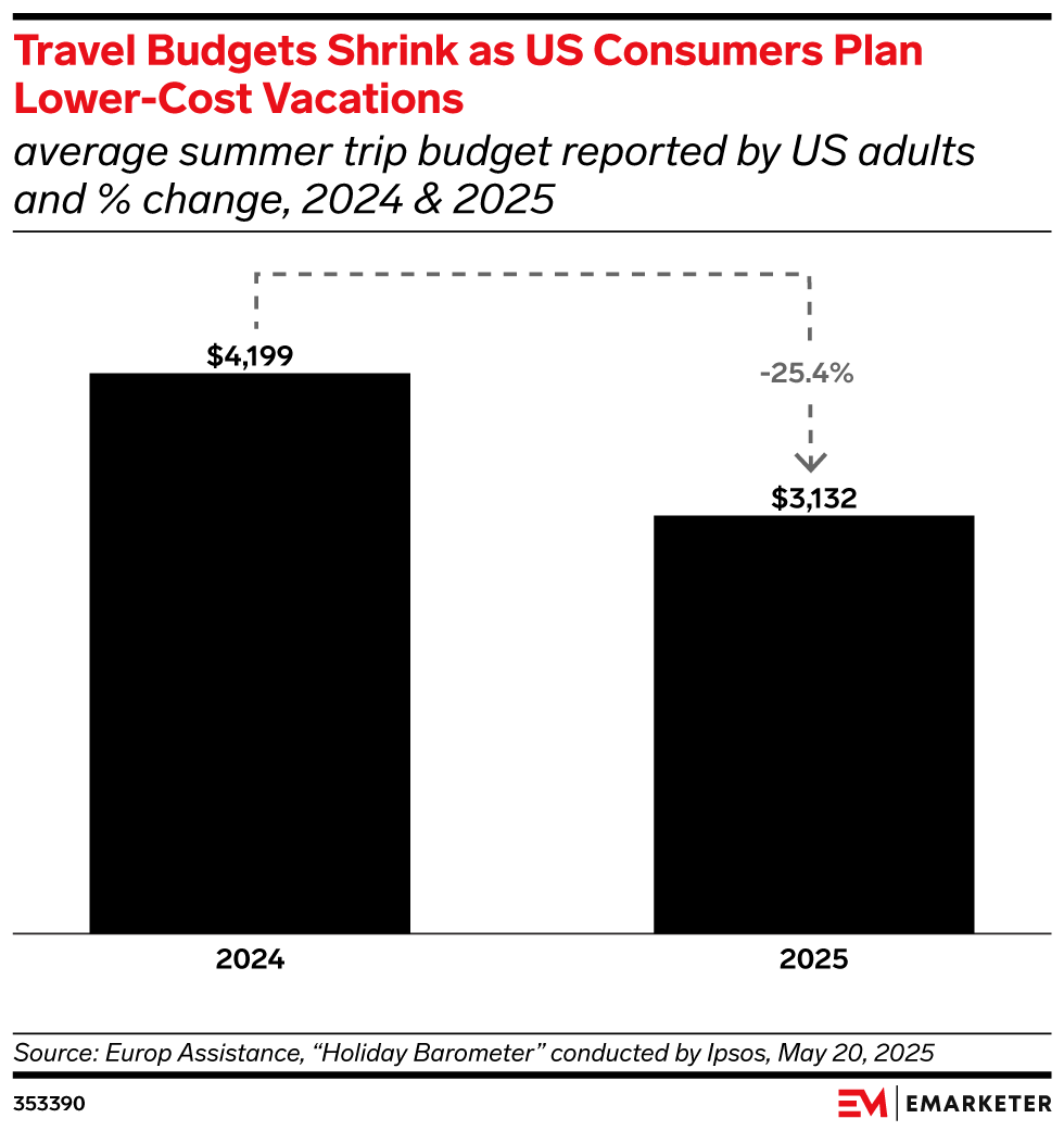 The trend: US consumers are pulling back on summer vacations. The average trip budget has dropped 25.4% YoY to $3,132, per an Ipsos survey for Generali Global Assistance. Our take: The pullback in travel spending is a canary in the coal mine. As economic anxiety deepens, more consumers will likely pull back further, scrutinize discretionary purchases, and double down on value. Retailers, brands, and travel companies should brace for a more cautious consumer in the second half of the year. To stay competitive, they should look for opportunities to: Sharpen their value messaging to align with price-sensitive mindsets; Stay closely attuned to shifting consumer sentiment through ongoing survey and trend analysis; Position themselves as allies in financial wellness, offering not just products, but practical ways to help consumers stretch their dollars further.