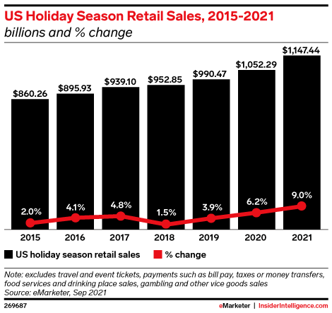 US holiday retail sales in 2021 will see the strongest growth in more than 20 years, rising 9.0% from last year to $1.147 trillion.
