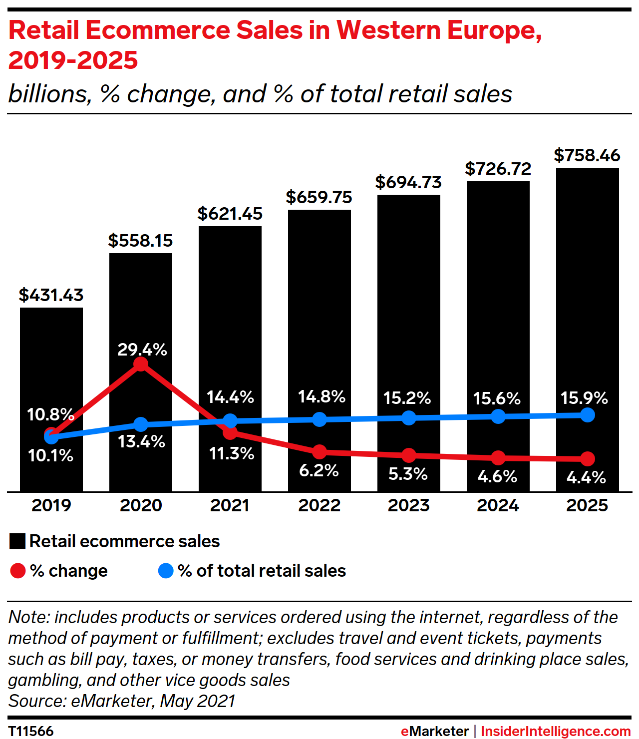 Following a year of lockdown-related growth in 2020, retail ecommerce sales in Western Europe will continue to rise for the next several years. By the end of 2022, ecommerce sales will account for 14.8% of total retail sales in the region and hit nearly $660 billion.