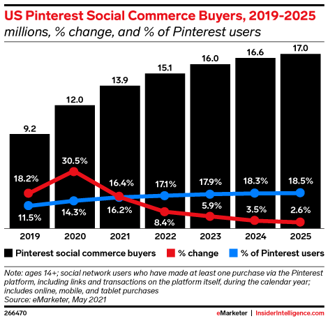 The number of US social buyers on Pinterest grew 30.5% in 2020, for a total of 12.0 million, per our estimates. By the end of 2021, that number will grow another 16.4% to reach 13.9 million.