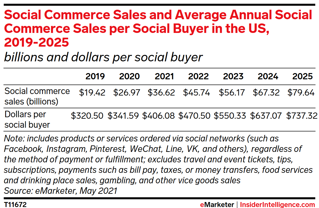 We expect US social commerce sales to rise by 35.8% in 2021 to $36.62 billion. That’s only a slight deceleration in growth from 2020, when sales surged by 38.9% thanks to the pandemic-driven boom in ecommerce, increased social media consumption, and brands continuing to leverage these platforms to sell directly to consumers.