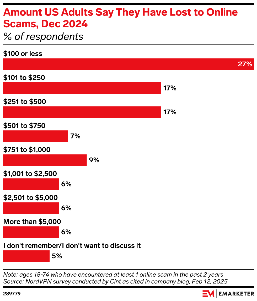 The news: Online scams and internet crimes cost Americans a record $16.6 billion in 2024, per Pew Research, potentially reshaping trust in digital platforms. Almost three-quarters (73%) of US adults have experienced some type of online scam, ranging from phishing attempts and online shopping scams to credit card fraud. Most adults report getting weekly scam phone calls (68%), emails (63%) or text messages (61%) that attempt to collect their personal information. The big takeaway: To attract new customers and assuage scam-related hesitations, brands need to be proactive about trust in every digital touchpoint.