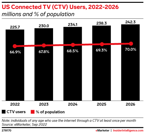 Smart TVs are used by 61.9% of US connected TV (CTV) households, making them the top CTV device by far, per Comscore CTV Intelligence. In second and third place are Amazon Fire TV (29.1%) and Roku (28.4%), respectively.