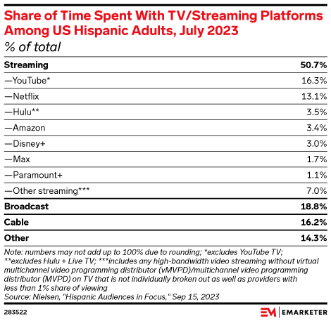 YouTube claims 10.4% of daily time spent with TV in the US, according to July 2024 data by Nielsen.